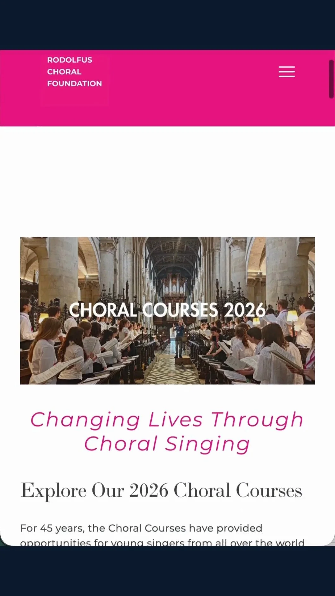 The Rodolfus Foundation is a charity committed to choral singing education. We run residential choral singing courses for children and young people: the Junior Courses are for children aged 8-15 and the Senior Choral Courses for young people aged 16-21. The courses are open to all and we operate a generous financial assistance.